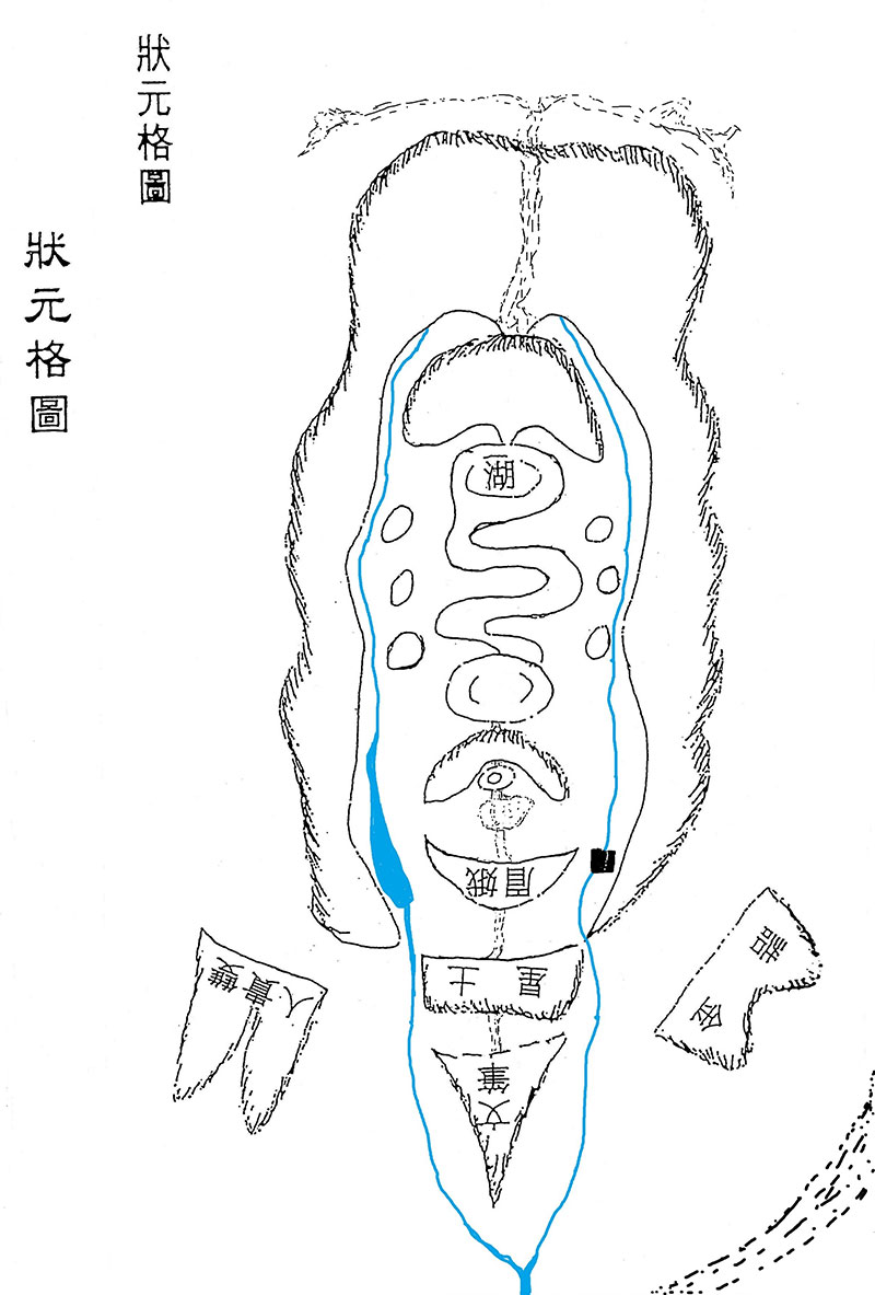 右关贞艮土龙起祖,降势入兑(酉),向东南驳换至太乙(巽),秉艮土生气,受穴于亥宫。